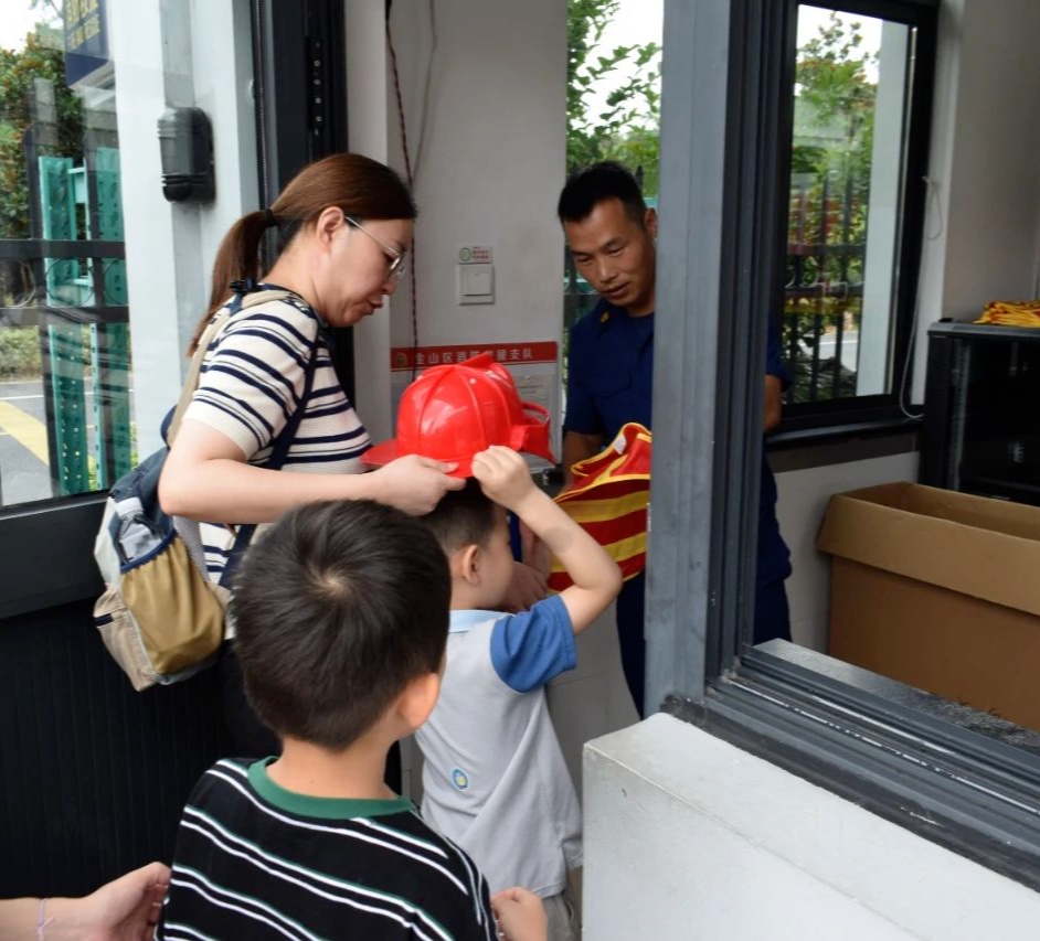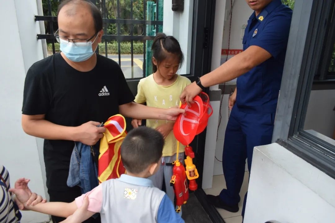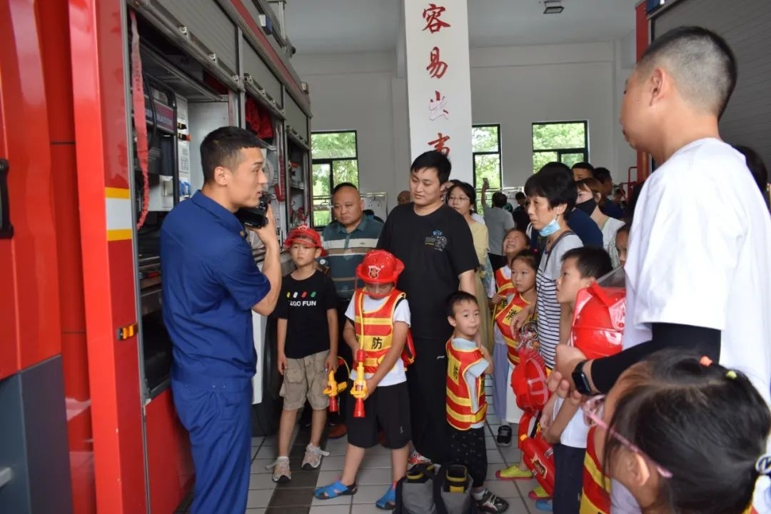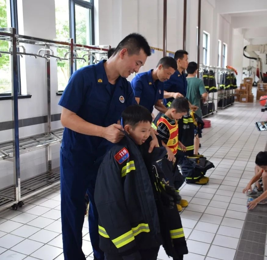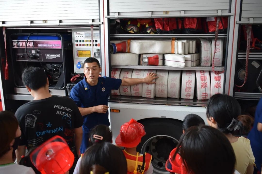 消防员带领孩子们乘坐了消防车,给他们讲解了常见的消防器材,并演示了滑铜杆快速出警。此外,孩子们还穿上了灭火服,“零距离”体验了一次消防员的日常。