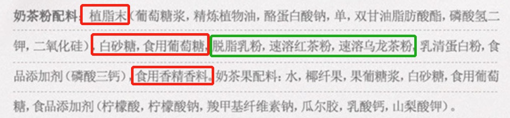 比如某款深受大家喜爱的某品牌速溶奶茶,配料主要是由植脂末,添加糖和香精构成的,其中也确实有奶和茶的成分,但成分较少。