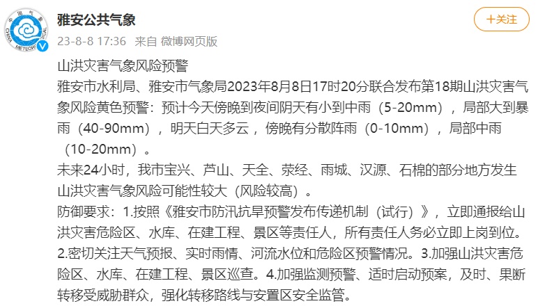 雅安市水利局、雅安市气象局2023年8月8日17时20分联合发布第18期山洪灾害气象风险黄色预警:预计8日傍晚到夜间阴天有小到中雨(5-20mm),局部大到暴雨(40-90mm),9日白天多云 ,傍晚有分散阵雨(0-10mm),局部中雨(10-20mm)。