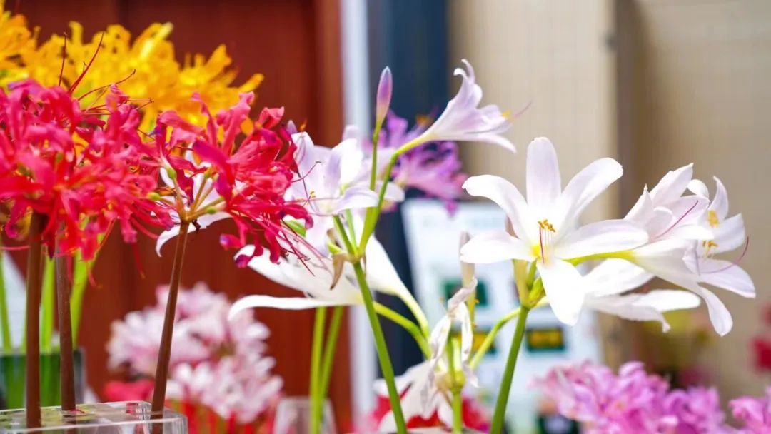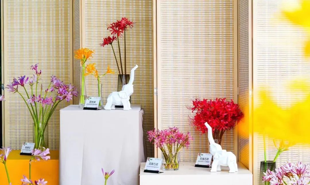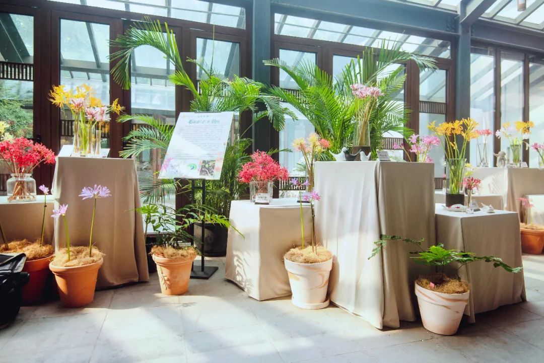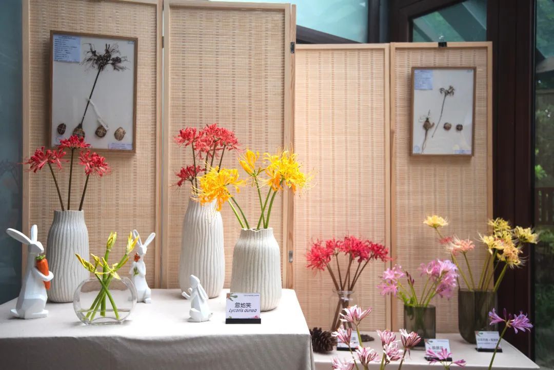 本展览以鲜切花、盆栽为主要形式,展出石蒜属植物共计13种。展厅中通过高低错落的积木块、竹屏风形成围合空间,分别对秋出叶类和春出叶类石蒜进行了集中展示。
