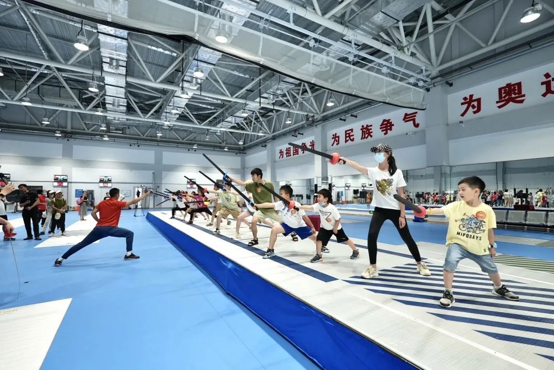 正值夏训期间,运动健儿们在训练场上挥洒汗水、奋力拼搏,市民代表们来到重竞技馆沉浸式感受运动队的风采。重竞技馆是一座占地3500平方米的大型综合训练场馆,融合了现代五项及击剑、跆拳道、拳击、武术、柔道六个项目。全运会冠军、上海男子佩剑主教练陈昊聪,全运会冠军、上海男子佩剑副教练刘星宇与市民代表们交流互动。两位明星教练为大家展示了明星墙,并生动讲解、演示了不同类型击剑比赛的规则。在积累了一定的击剑小知识后,现场的小朋友们都迫不及待地穿上击剑服,戴上头盔,跟随专业运动员们的动作指导,学得有模有样。