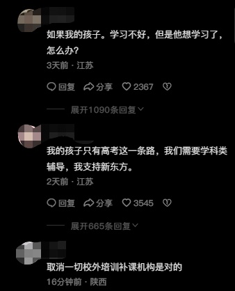 近日,新东方(NYSE:EDU)杭州线下中心突然全面关闭,起因是百万粉丝博主“铁头”举报杭州新东方违规补课。在铁头更新的多条视频中,包括《“双减”政策实施两年来为何愈演愈烈?》《纵使前方荆棘满布我亦砥砺前行!》《希望我燃烧自己的火焰会点亮一点星火》,视频封面配上了头字:“勇闯东方”“决不妥协”“前路荆棘”。上述视频发布后,引发了很多争议,网友的观点也分为了两派,一部分是支持,认为违规教培必须要进行打击,否则只会越来越卷;而另外一部分则认为不能打击,因为有市场有需要。