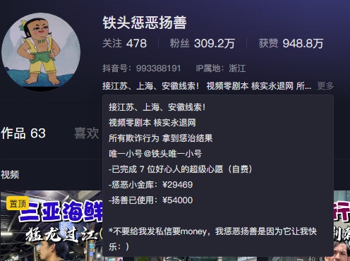 铁头会在每条视频的评论区求粉丝打赏,其简介显示,“惩恶小金库还剩余29469元,扬善已使用54000元”。但其直播间里再三强调,自己现在不考虑赚钱,对欺诈消费者行为本身就深恶痛绝。网友认为,这些流量博主最终目的还是为了变现,怀疑其动机。比如,同类型的博主“辛吉飞”、“B太”等人已经开始了直播带货。坐拥两千多万粉丝的“B太”在今年“618”直播带货,销售的商品包括山东油桃、精选虾皮等。有数据显示,“B太”首场直播,单场观看人次超110.9万,累计销售额近百万元。反观另一百万级主播“辛吉飞”,从去年年底就开始推荐各种选品,酱油、海参、红茶、枸杞原浆等产品陆续出现在他的视频中。同样,“铁头”也被网友扒出,与杭州铁拳文化传媒有限公司相关联,疑似在为后续直播铺路。据企查查APP显示,该公司成立于2023年6月6日,注册资本50万元人民币,许可项目包括演出经纪、互联网直播技术服务等。对此,据潮新闻报道,“铁头”回应称,现在仍是支出大于收益,收益主要来自直播打赏和假一赔三的赔付款,但未来不排除做直播带货。“铁头”的言行如此高调,有网友担心他的人身安全。据南国早报报道,“铁头”表示他已接到威胁电话,但他并不害怕,将与欺诈消费者的商户“斗到底”。本文来源:文汇报