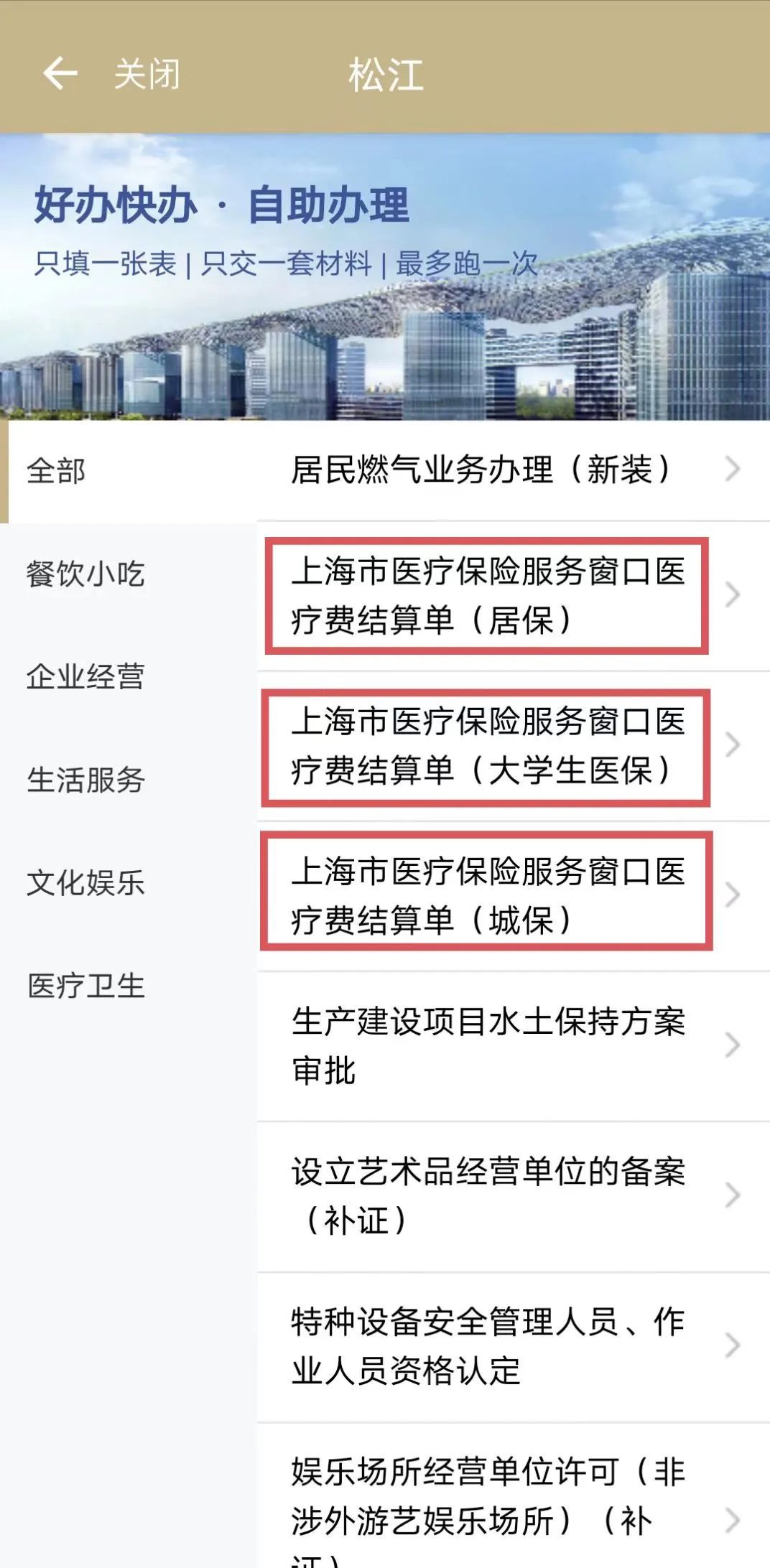 找到“上海市医疗保险服务窗口医疗费结算单”事项,根据所参加的医保类型,选择“居保”“大学生医保”“城保”,进入相应办理的业务