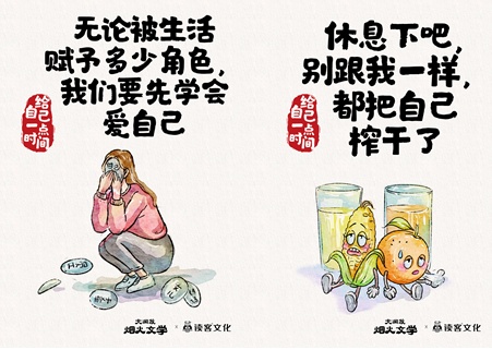 即日起至8月20日,大润发与读客文化联合发起烟火文学系列之“给自己一些时间”主题活动。此次烟火文案从人们日常生活购物场景出发,以牛角包、麻薯、鲜榨橙汁等商品为主角进行创作。如超市作为生活的承载者,配以柴米油盐的插画,发问:“你有多久没爱自己了?”;以鲜榨果汁的视角告诉大家:“休息下吧,别跟我一样,都把自己榨干了”;还有牛角包的“劝说”:“今天不钻牛角尖,吃个牛角包”……