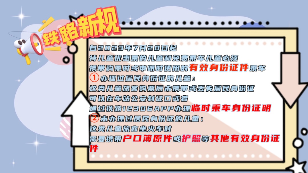 铁路部门近期发布新规:“7月20日开始,儿童需携带有效身份证件才能进站乘坐火车”,此处所指的“儿童有效身份证件”其实并不是单指居民身份证,还包括居民户口簿、出生医学证明、护照等。