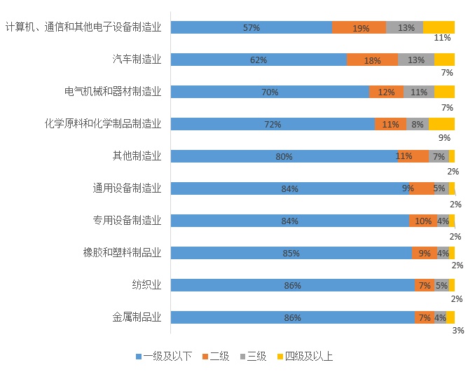综合选取企业样本量超过1000家的行业进行统计分析的结果显示,从成熟度等级分布看,计算机、通信和其他电子设备制造业、汽车制造业、电气机械和器材制造业三级及以上高成熟度企业占比较高,分别为24%、20%和18%。