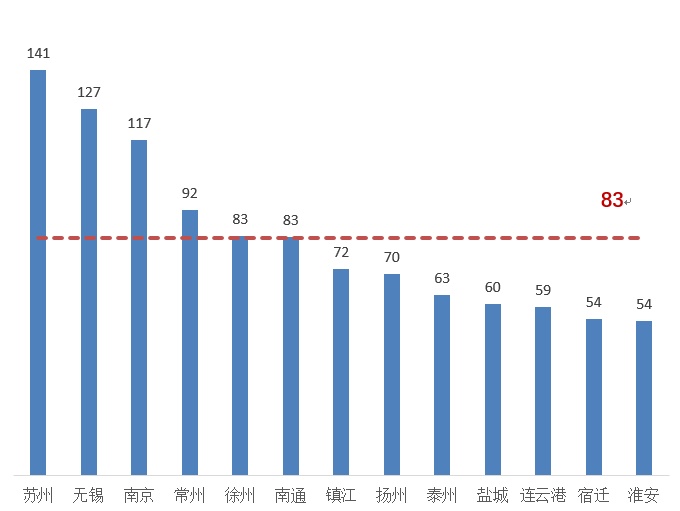 2022年,江苏省13个设区市智能制造发展指数平均得分为83,TOP3城市分别为苏州(141)、无锡(127)、南京(117)。各市根据得分可以划分为三个梯队,苏州、无锡、南京处于第一梯队,得分均超过100。常州、徐州、南通处于第二梯队,得分在83-100之间。镇江、扬州、泰州、盐城、连云港、宿迁、淮安处于第三梯队,得分在50-83之间。