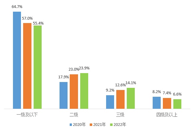 《报告》显示,从全省规上制造业企业智能制造能力成熟度水平看,2022年,35.8%的规上制造业企业处于智能制造能力成熟度一级,开始了数字化改造;23.9%的规上制造业企业达到成熟度二级,实现了核心业务环节的数字化网络化;14.1%的规上制造业企业迈进成熟度三级,实现了网络化集成及单点智能;6.6%的规上制造业企业达到四级以上的高成熟度,深度应用智能化。相较于2021年,2022年全省“三级及以上”高成熟度规上企业占比提升7个百分点,说明省内企业转型升级成效明显。