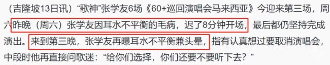 事实上,在马来西亚的第二场演唱会上,张学友就因为“耳水不平衡”头晕推迟了8分钟开场,连续两日头晕不适,“歌神”的身体状况引发歌迷担忧。