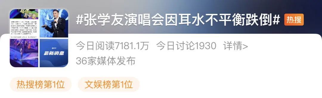 据报道,当时观众都以为张学友只是跌倒,不过其后张学友自揭从小有耳水不平衡的问题,几乎每年都会发作一次,之前都未曾在演唱会上遇到耳水不平衡而头晕,但13日在演出前半小时,已经突然开始头晕,并称:“所以大家看到今天跳舞非常特别。”