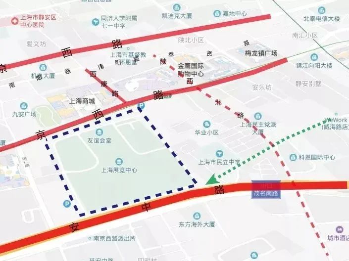 由巨鹿路/富民路经常德路—安义路—铜仁路骑行至南京西路铜仁路或延安中路铜仁路口附近