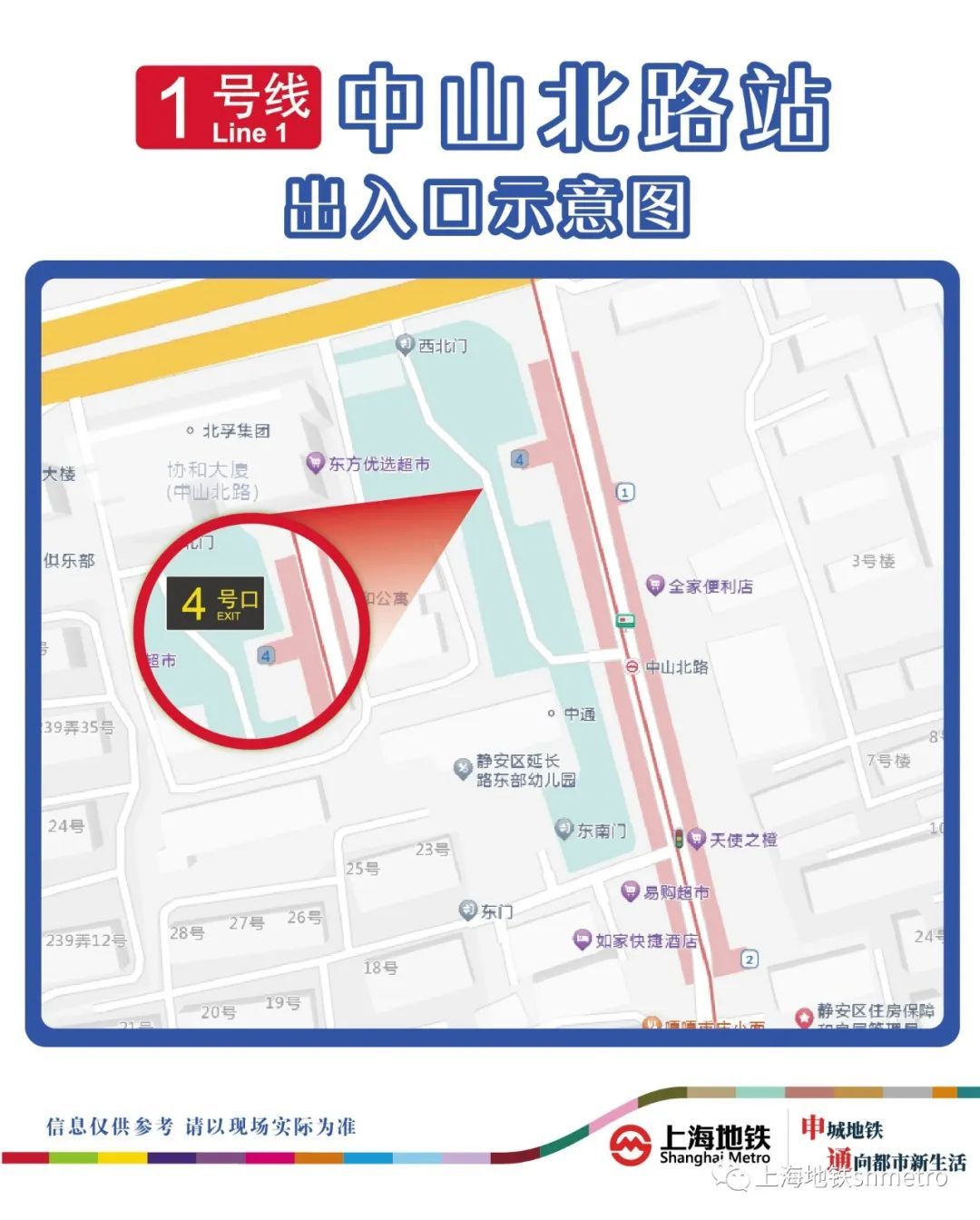 1号线中山北路站4号出入口和自动扶梯已完成改造施工,4号口于2023年8月15日起恢复启用。