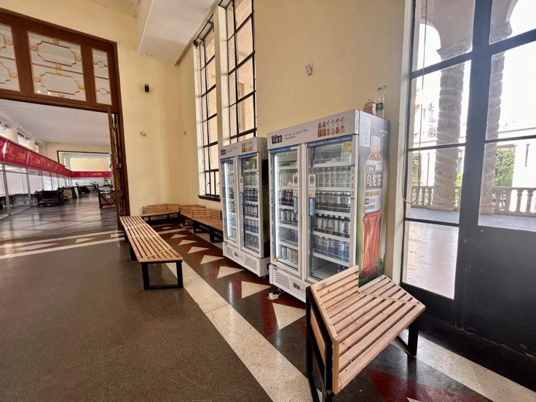 事实上,曾获“上海十佳建筑”“新中国上海十大金奖经典建筑”的上海展览中心,就是一件值得欣赏的展品。近年来,书展主办方一直致力于让市民更多发现这座建筑本体的美。一扇扇巨大玻璃窗前设置了读者休憩区域,比如在西一馆二楼的这个圆厅对面,就有两台饮料自动贩卖机和环绕的长排座椅。