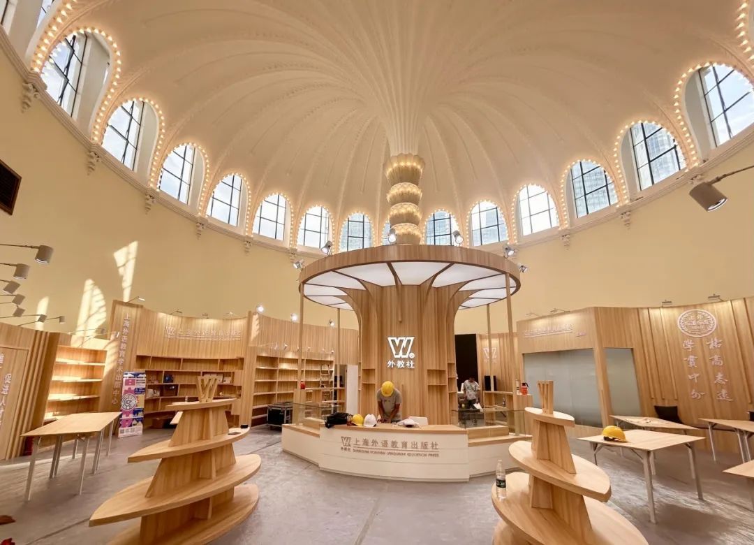 再往前走,往年设置全家便利店的圆厅,今年首次由上海外语教育出版社入驻,令人眼前一亮。以原木色为主色调,无论是中央圆形岛台还是四周弧线形书架,都贴合建筑本身,光影斑驳投射在书架上,可能是今年书展最美的展厅之一。
