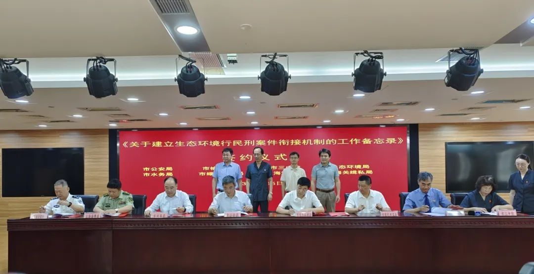 值此契机,上海市公安局、上海市生态环境局、上海市水务局、上海市绿化和市容管理局、上海海警局、上海海关缉私局、上海市人民检察院第三分院、上海市第三中级人民法院,共八部门在市三中院举行《关于建立环境资源民行刑案件衔接机制的工作备忘录》签约仪式。