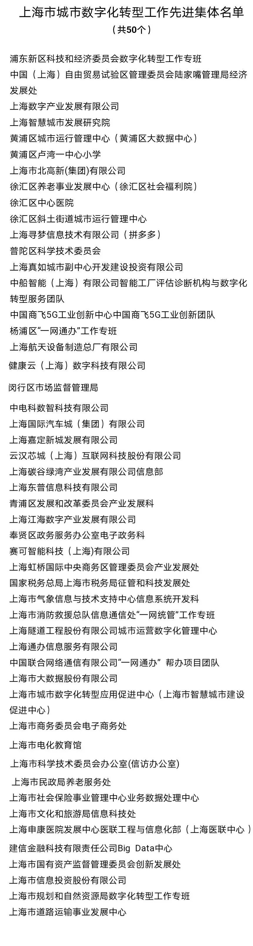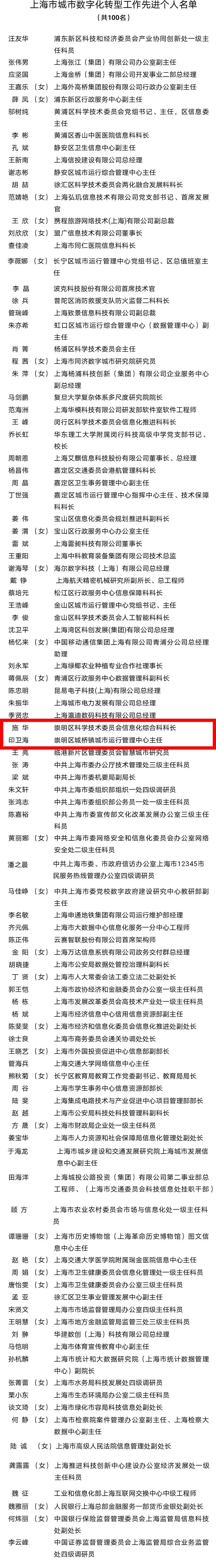 为表彰先进、树立典型,充分激发广大企事业单位、干部群众顺应科技和产业变革、投身数字化转型工作,上海市城市数字化转型工作领导小组办公室、上海市经济和信息化委员会、上海市人力资源和社会保障局决定,授予浦东新区科技和经济委员会数字化转型工作专班等50家单位“上海市城市数字化转型工作先进集体”称号;授予汪友华等100名同志“上海市城市数字化转型工作先进个人”称号,其中崇明区科学技术委员会信息化综合科科长施华,崇明区城桥镇城市运行管理中心主任印卫海入选。