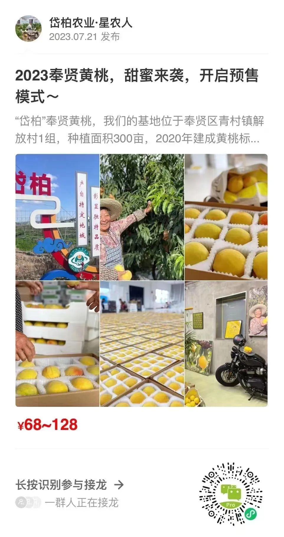 炎炎夏日,热浪扑面而来。看着窗外艳阳高照,窝在空调间里,吃着时令农特产,这才是夏天该有的样子! 奉贤黄桃作为奉贤区特产,在市场上深受消费者喜爱。就在这个夏天,青村镇耗时五年培育的桃子“新品”——“初生果”黄桃正在热销,跟着小编一起来了解一下吧! 黄桃种植作为青村当地的传统经济来源,近年来,面临“人老、树老、地老”问题,发展历经波折。 经过多年的探索与试验,青村镇在建立农业标准化管理体系的同时,开展新品种、新栽培模式等方面的研究,不断优化桃园种植细节。 青村镇各大农产品产销专业合作社颠覆传统的栽培管理模式,淘汰“开心”型树形,采用“Y”型,种植方式大升级。 据了解,“Y”型种植可以让桃树通风透光、减少病虫害、产量增多……各项技术操作,如修剪、疏花疏果、套袋等,变得更加便捷容易,同时有效提高了果农的劳动效率。 据现场工作人员介绍,这个等待多年才收获的果实,由于科学栽培、光照充足、土壤肥沃等优势,产出的果实大小均匀、品质优良,颜色更为一致、口感更加香甜软糯。 这款奉贤特有的“初生”黄桃,可以让你整个盛夏都沉浸在甜蜜里。小编在此提醒各位,黄桃的赏味期较短,大家可要抓紧时间去线上线下各渠道购买品尝哦!