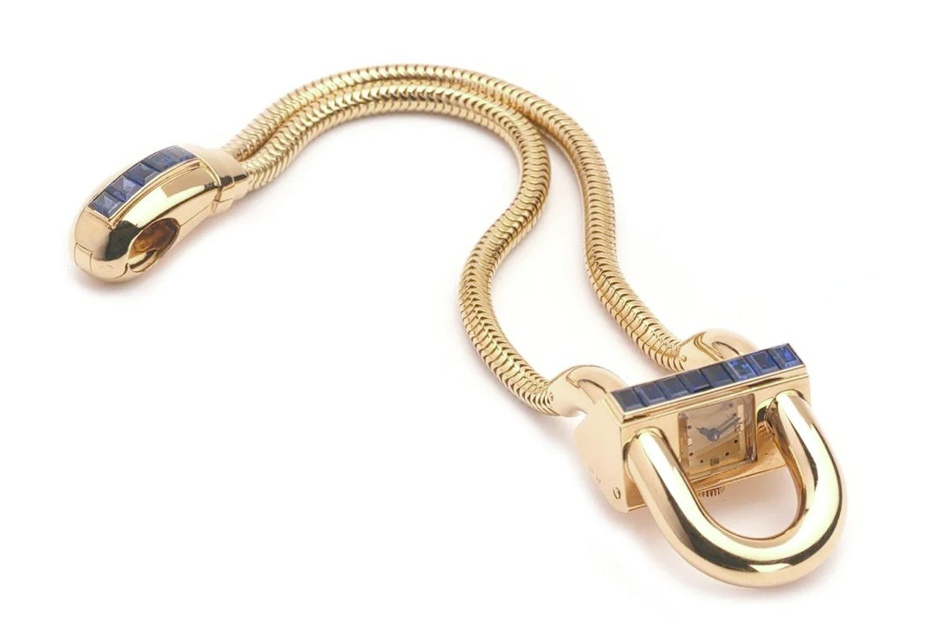 ▪ 梵克雅宝,《Cadenas腕表》,1943年,金银铜合金,蓝宝石,185×25×12毫米。梵克雅宝收藏。