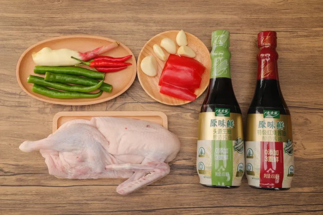 草鸭500克、仔姜50克、蒜子20克、红椒20克、青线椒30克、小米椒30克、原味鲜红烧酱油10克、原味鲜生抽20克、白砂糖5克、三鲜鸡精3克。