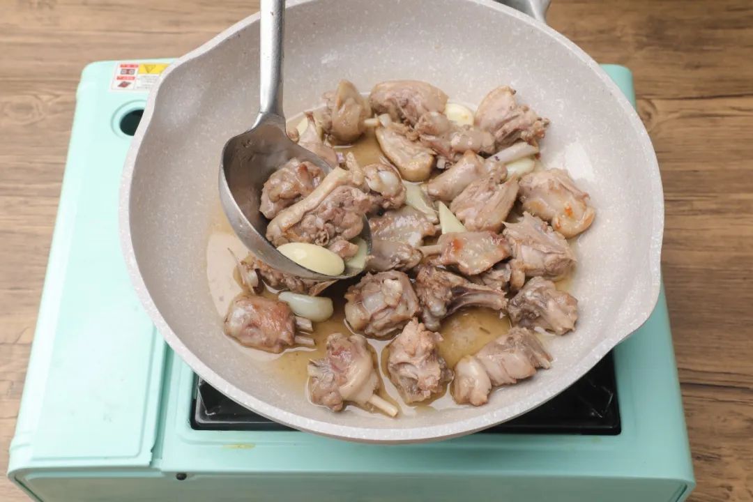 3.锅中加入50克食用油,倒入鸭子煸炒至没有水分,捞出待用。