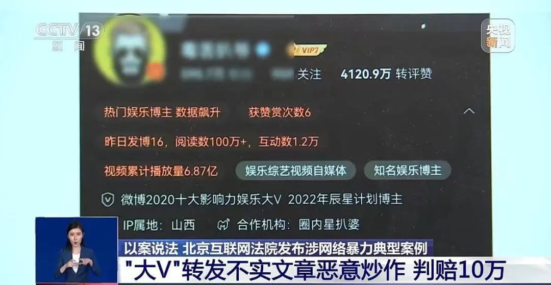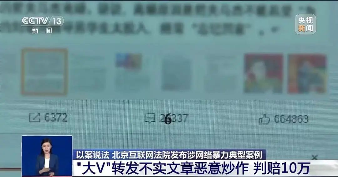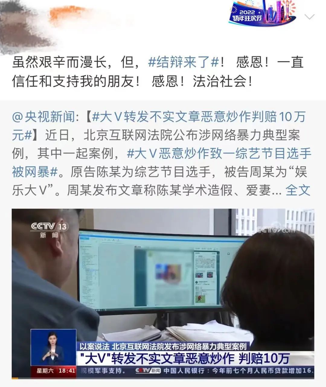 据央视新闻报道,近日,北京互联网法院公布了一起涉网络暴力典型案例。原告陈某为综艺节目选手,被告周某为“娱乐大V”。周某发布文章称陈某学术造假、爱妻人设破灭等,一度登上热搜。