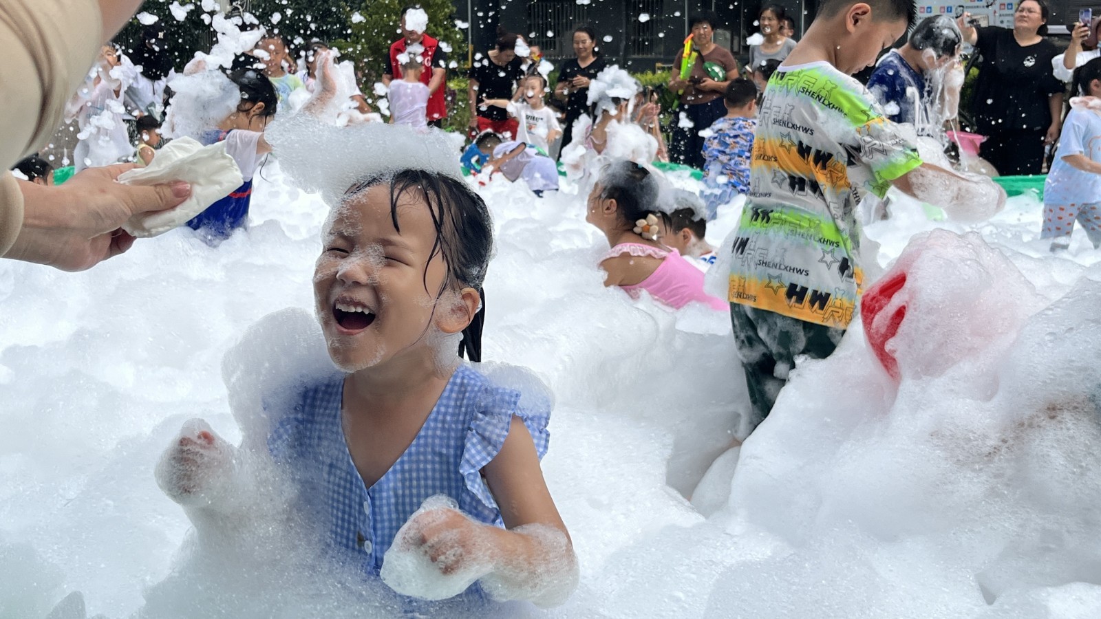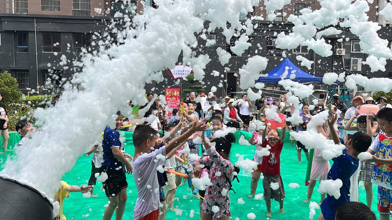 大型泡沫机喷洒出的泡沫让活动达到了高潮,“下雪啦,下雪啦!”活泼可爱的孩子们,在音乐的感召下,一起律动,一起狂欢。在“大雪纷飞”中,奔跑着、躲闪着,大家你追我赶,喊声、欢笑声混成一片,社区变成了一片欢乐的海洋。家长与孩子们在一片白白的“泡沫世界”里结束了本次的“关爱儿童 守护成长”亲子泼水节活动。