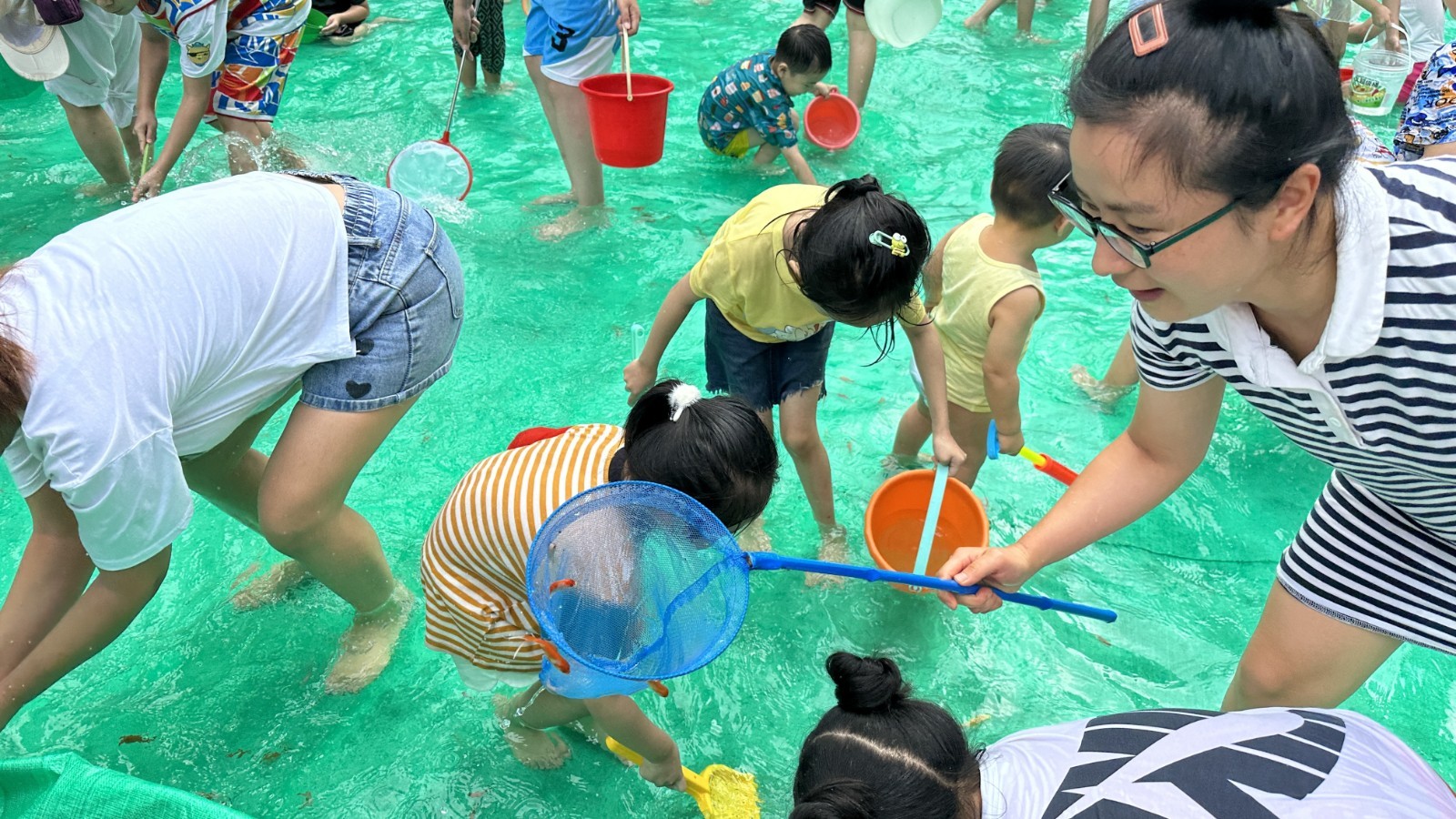 活动中,还穿插进行了水中潜水员、水球小冠军、捕鱼达人等多个比赛环节,各种惊喜嗨翻全场。主持人组织孩子们进入浅水池中玩“水中潜水员”游戏,通过此类游戏引导青少年儿童远离河岸,筑牢防溺水安全防线;“捕鱼达人”环节,孩子们纷纷拿起小渔网争做“捕鱼达人”,他们相互比赛看看谁捞的小鱼多,活动现场充满了欢声笑语。
