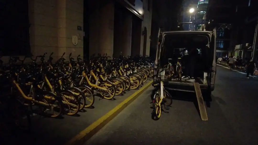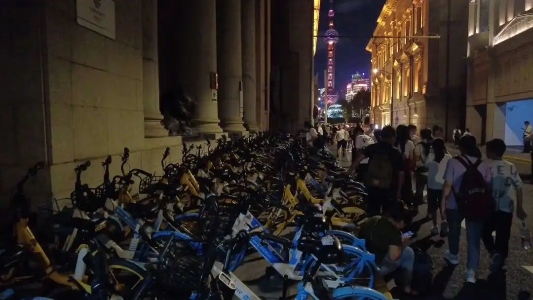 相对而言,九江路等小马路通往外滩人流比较少。不过,由于骑行而来的游客较多,使得街道两旁被共享单车占据得满满当当,因此需要派出专人守候清运。据了解,工作人员一个晚上需要搬运一千多辆单车,周末、节假日更多。