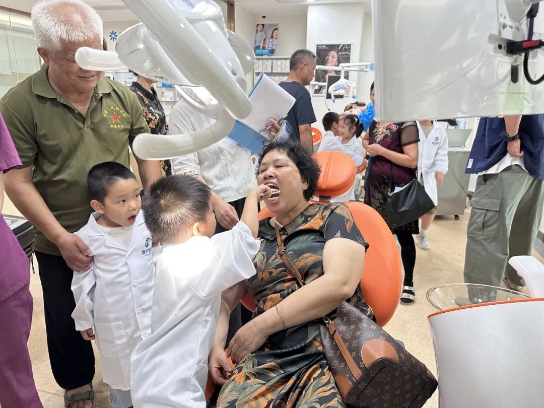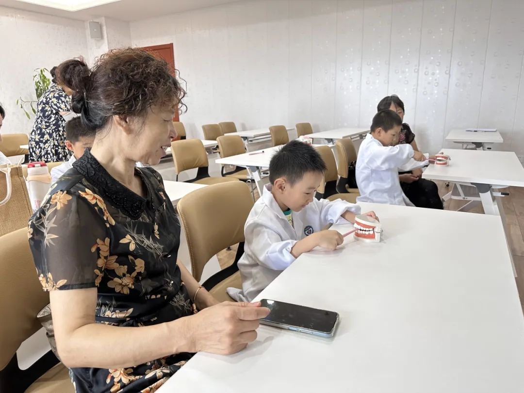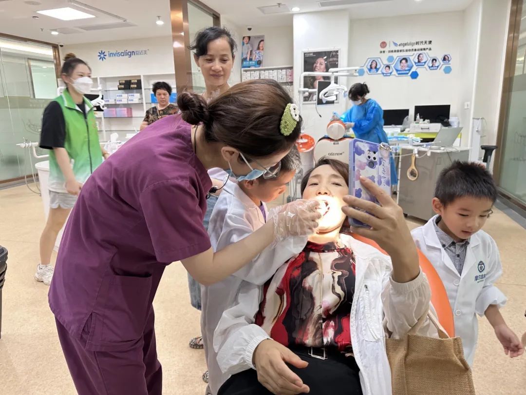 科普结束后,小朋友们在牙医姐姐的指导下,使用口腔镜给大人们进行口腔健康检查。从枯燥的文字到有趣的实操,小朋友们将讲座中的知识运用到了实际,以寓教于乐的方式在潜移默化中提高对牙齿健康的重视程度。