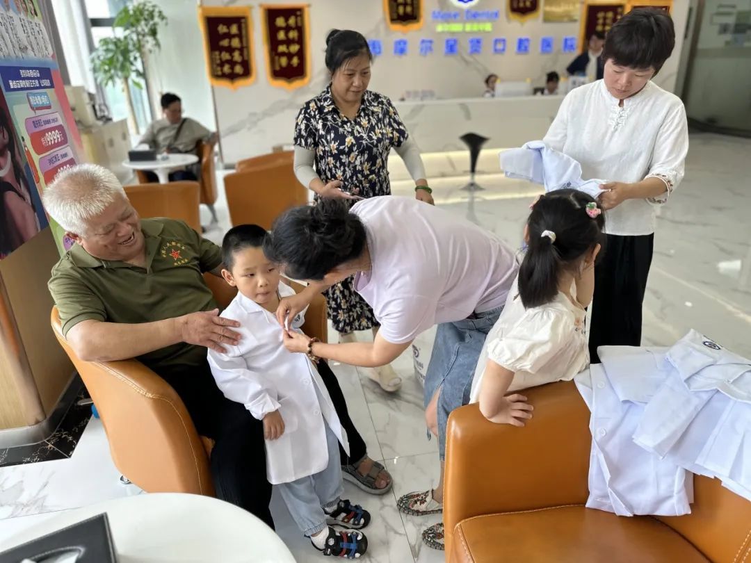 为了能更快进入“角色”,小朋友们一入场便换上了“职业”服装。穿上白大褂,“小小牙医”正式上岗。