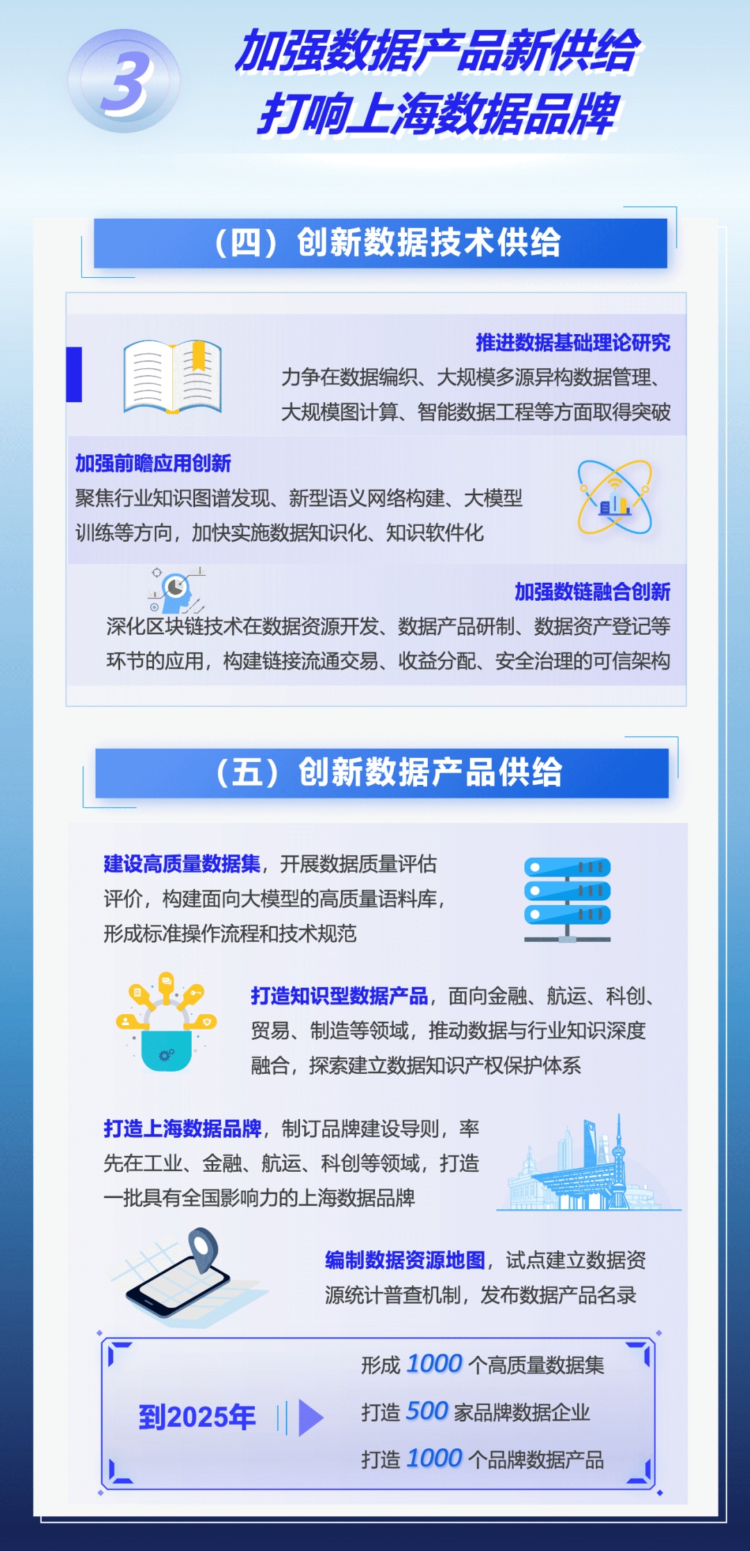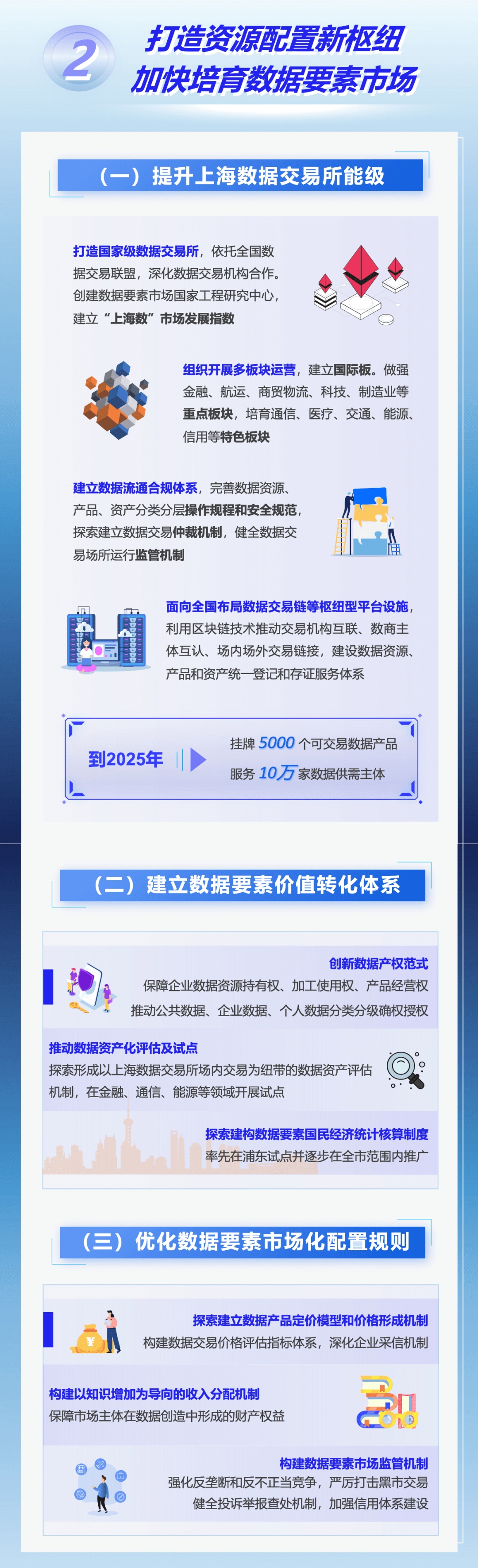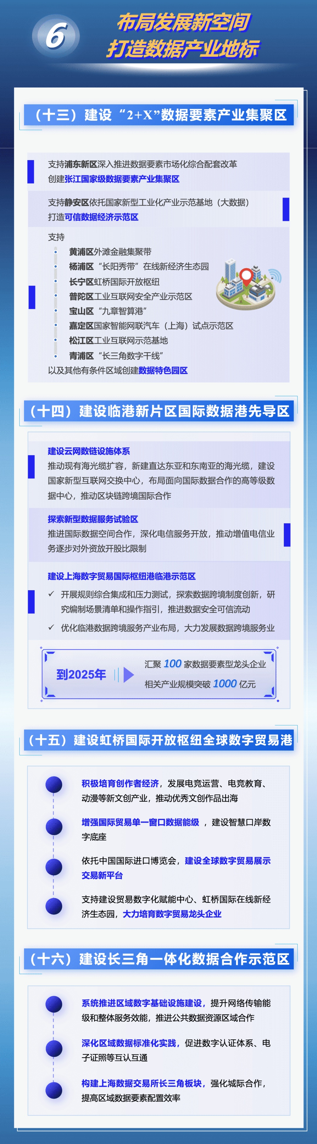 为着力建设具有国际影响力的数据要素配置枢纽节点和数据要素产业创新高地,本市出台《立足数字经济新赛道推动数据要素产业创新发展行动方案(2023-2025年)》,在加强数据产品新供给、激发场景应用新需求、发展数商新业态等七方面采取措施,力求到2025年数据要素市场体系基本建成,国家级数据交易所地位基本确立,数据产业规模达5000亿元。来看图解↓