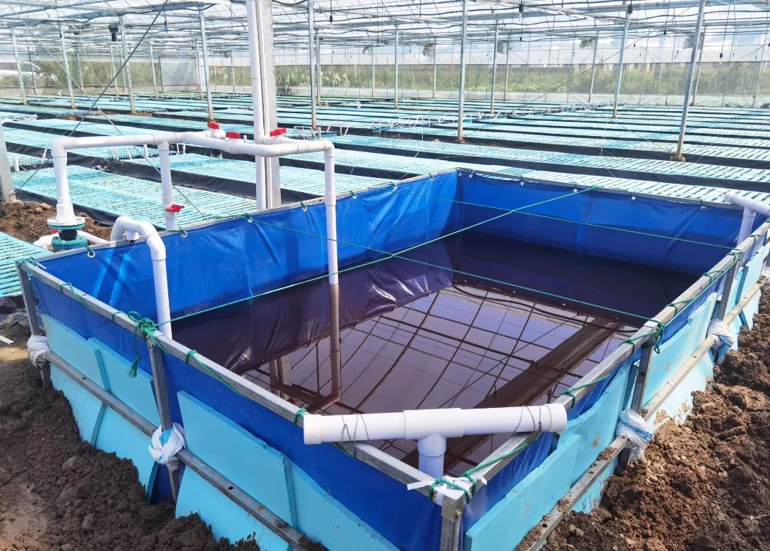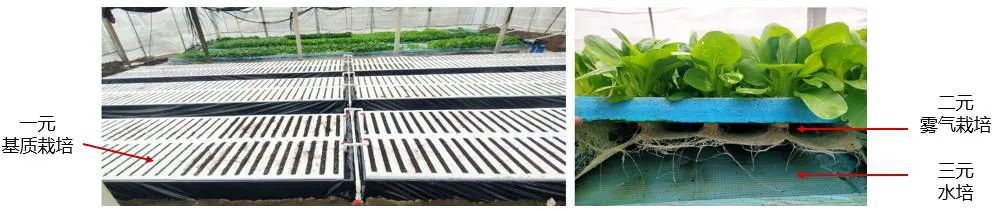 与传统无土栽培不同,景瑞果蔬专业合作社研发了独创的“三元水培法”,于今年4月开始使用。所谓“三元”是结合了基质栽培、雾培和水培的种植技术,运用管道栽培的高营养液使用效率加低设施投入成本的栽培模式,栽培基质主要由椰糠、火山石、有机肥组成。在大棚的一侧,可以看到一个存储营养液的方形池子,白色的管子从池里连通出来一直延伸分散到整个大棚。水培的灌溉系统就埋在整片栽培基质下,打开总开关,通过管线就可以将营养液输送到各个角落。