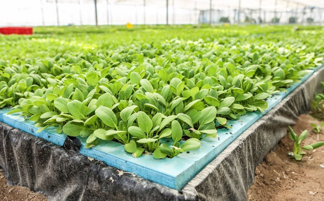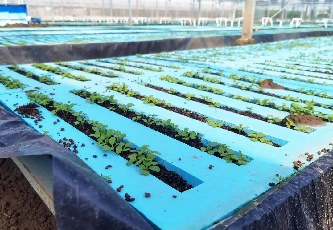 一早,在蔬菜大棚里,几位菜农在采收刚长成的新鲜鸡毛菜。一排排蓝色的种植槽里栽满了郁郁葱葱的植株,长势喜人。这里就是景瑞果蔬专业合作社的无土栽培种植基地。