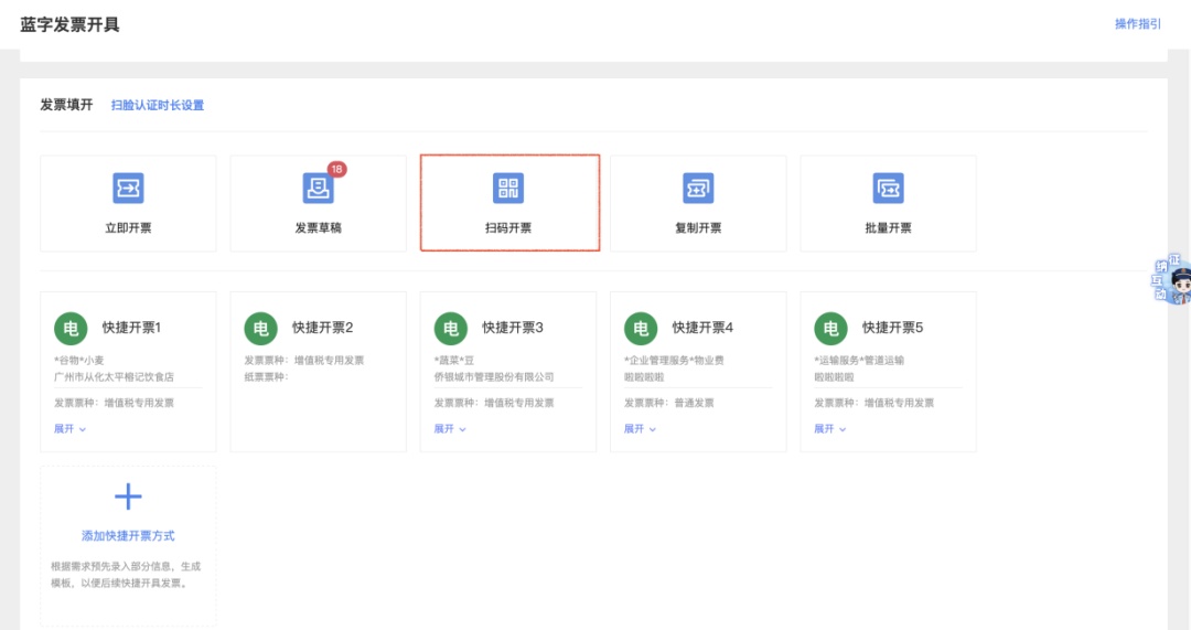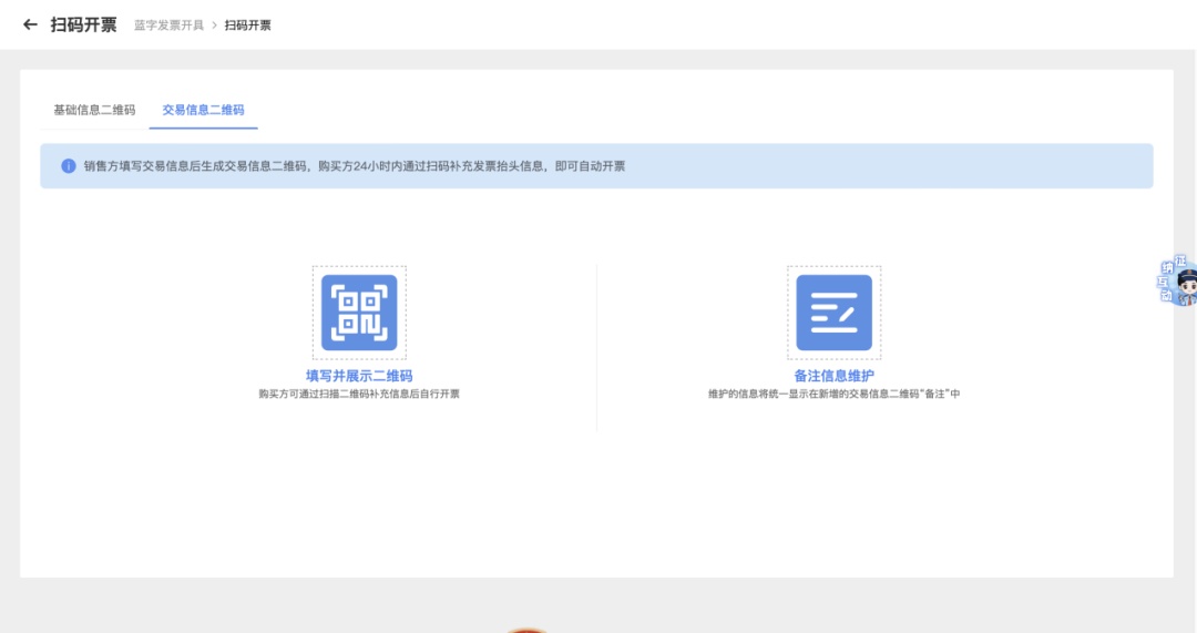 答:纳税人在蓝字发票开具二级首页点击【扫码开票】功能,开票列表界面左上角会展示【基础信息二维码】和【交易信息二维码】标签页。