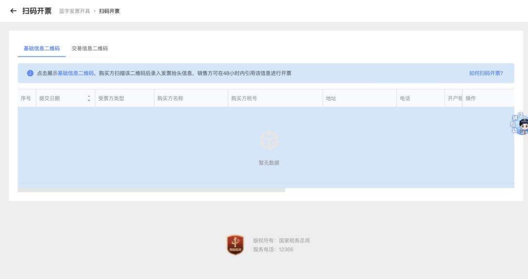 其中【基础信息二维码】长期有效,购买方通过扫码该二维码填写购买信息,信息将同步显示在主页面的列表中。销售方收到购买方提交的信息后,登录电子税务局,点击【蓝字发票开具】-【扫码开票】,选择购买方提交的信息以及对应的发票类型、票种,录入销售方信息,填写交易信息后点击【发票开具】。购买方填写的信息有效时限为48小时,即销售方需在48小时内开具对应发票。