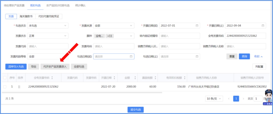 答:由税务机关代开的农产品销售发票以及3%征收率农产品专用发票,需由纳税人通过“代开农产品发票录入”功能进行采集,录入自产农产品票面金额和有效抵扣税额提交后,再进入“抵扣勾选”页面进行勾选抵扣。