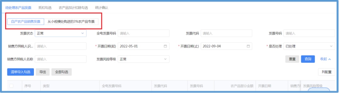 答:纳税人取得税控系统开具的农产品销售发票以及所有系统开具的3%征收率的农产品专用发票,需要通过【税务数字账户】—【发票勾选确认】—【抵扣类勾选】—【待处理农产品发票】模块进行处理。