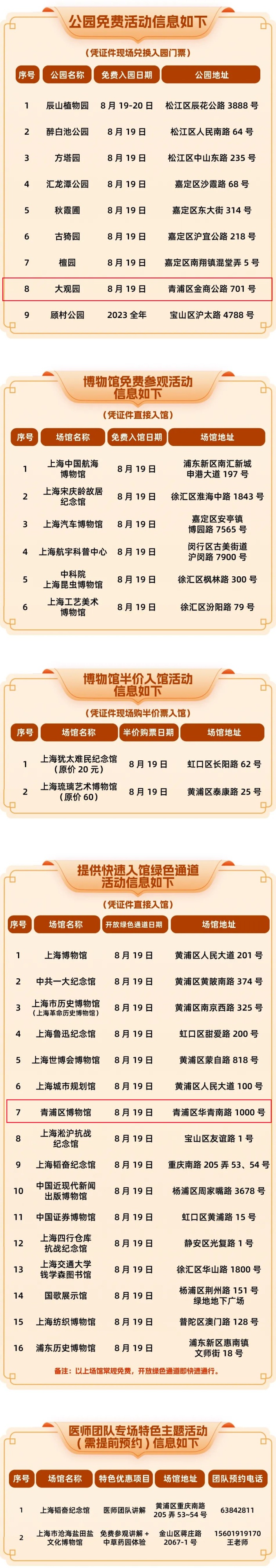 2023年8月19日(周六)是第六个中国医师节。今年节日主题为“勇担健康使命,铸就时代新功”。为感谢广大医师在日常医疗服务中的辛勤付出,激励医务人员踔厉奋进,切实担负增进人民健康福祉的光荣使命,营造全社会尊医重卫的良好氛围,由上海市卫生健康委员会指导,上海市医师协会联合上海市旅游行业协会、上海市博物馆协会,在今年中国医师节期间,组织本市部分公园、博物馆为医师提供优惠便利活动。内容如下: 医师入园(馆)需持本人身份证原件,并出示以下三种方式之一的有效证件:纸质的医师资格证书或医师执业证书;通过随申办出示医师执业证书电子证照;通过医师电子化注册平台个人端出示医师电子证照。 来源:乐游上海 实习编辑:索朗央宗 编辑:李璨