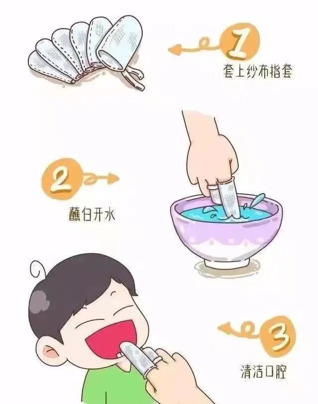 选择干净的纱布,将其缠绕在家长手指上,蘸取洁净温热水(以不滴水适宜),伸入宝宝口腔轻轻擦拭各部位黏膜及牙床。