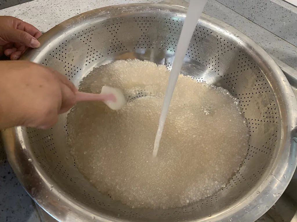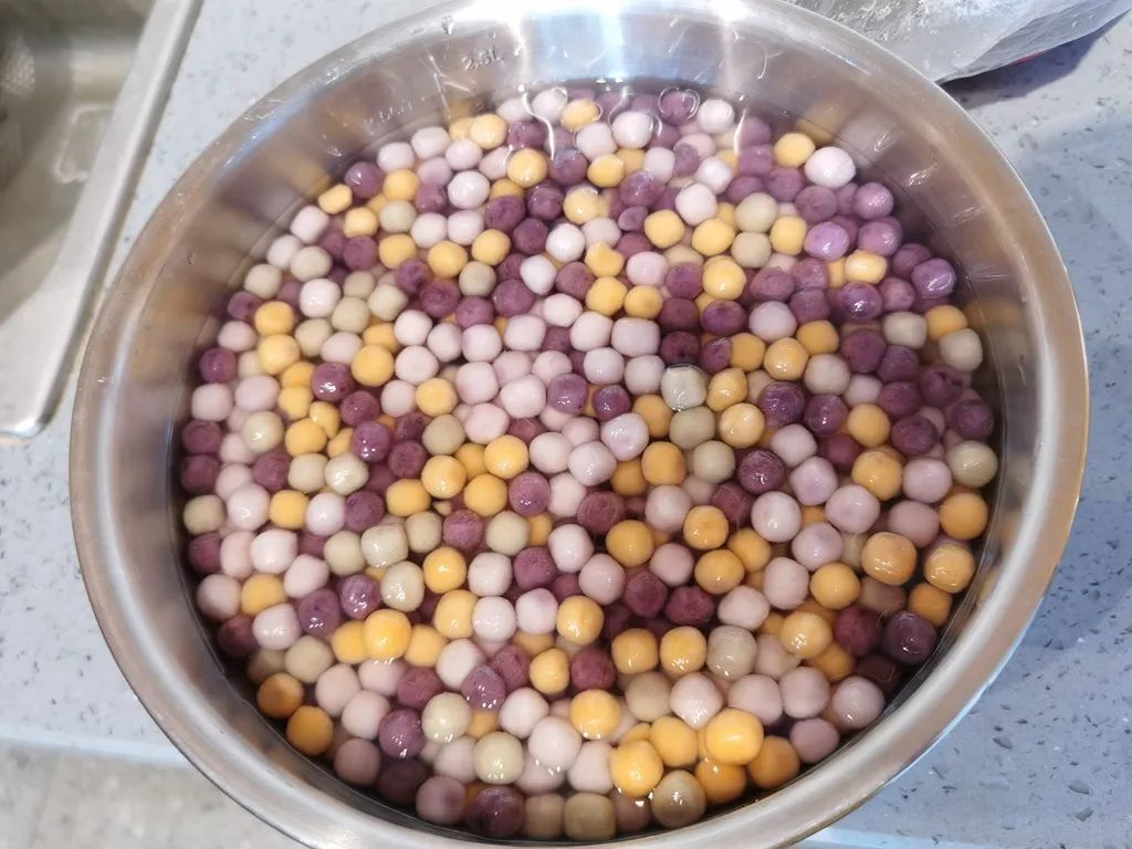 步骤5:将水煮开后下入芋圆,至芋圆浮起后再煮3分钟左右捞起过凉水。取剩下的糖水以1:1的比例放入芋圆中,剩下的糖水备用。
