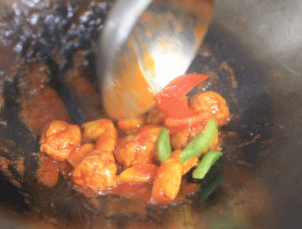 7.加青红椒丁翻炒几次,确保均匀地裹上酱汁。