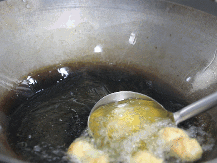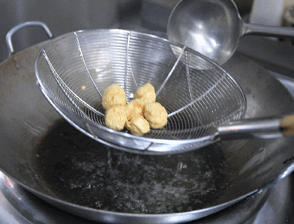 1.油热下锅,把裹好淀粉的肉球依次放入油炸。