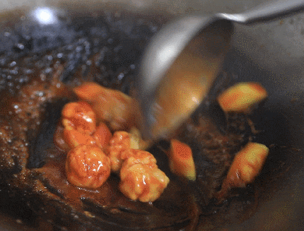 6.当酱汁变粘稠、红亮时,放入炸好的肉和菠萝块,来回翻炒。