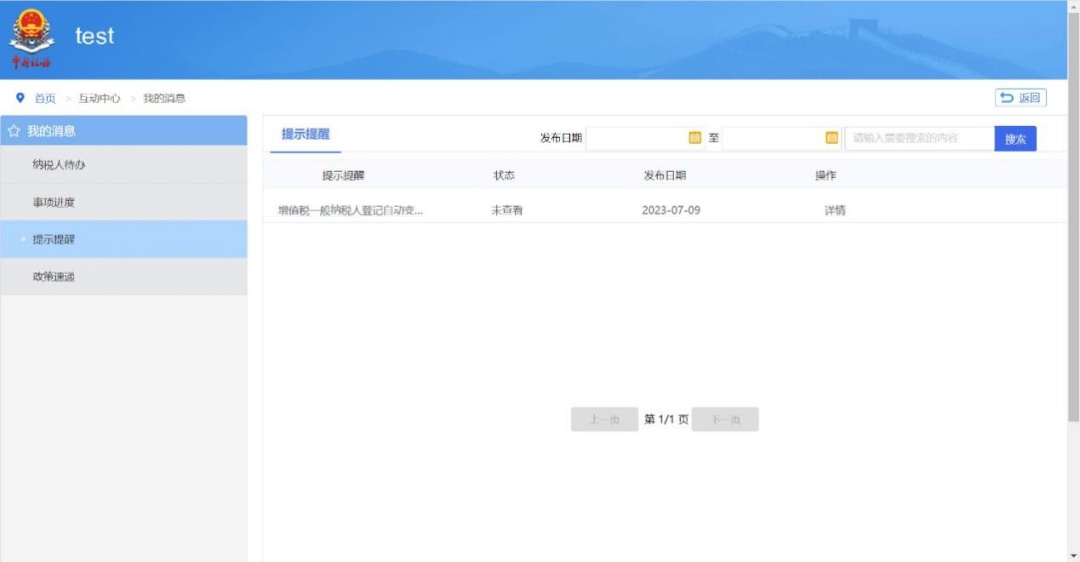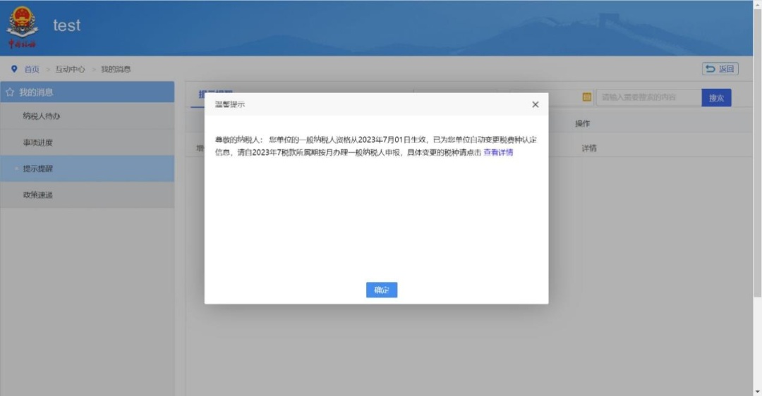 2.税(费)种认定信息自动变更完成后,将在电子税务局首页办税桌面的【提示提醒】中产生一条“增值税一般纳税人登记自动变更税(费)种认定”的提示消息。