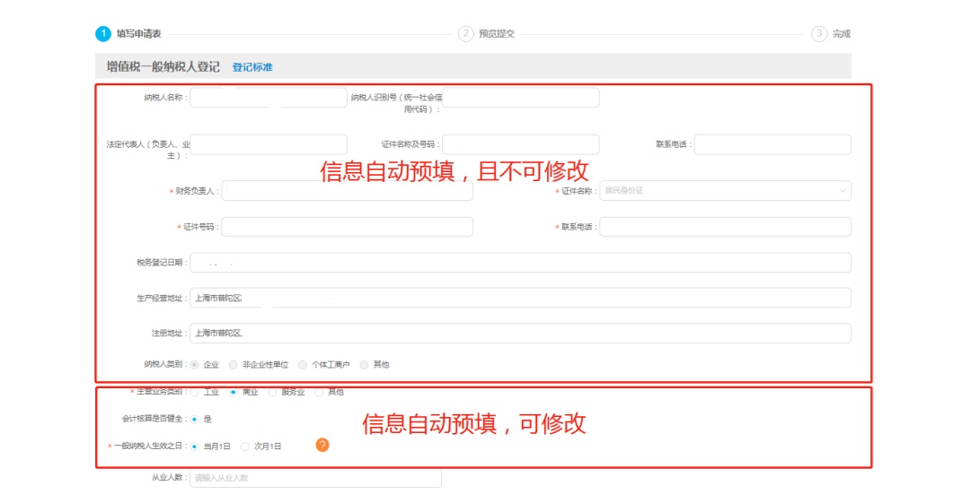 确认提示信息后,系统将自动带出纳税人的登记信息,请选择“主营业务类别”、“会计核算是否健全”和“一般纳税人生效日期”。