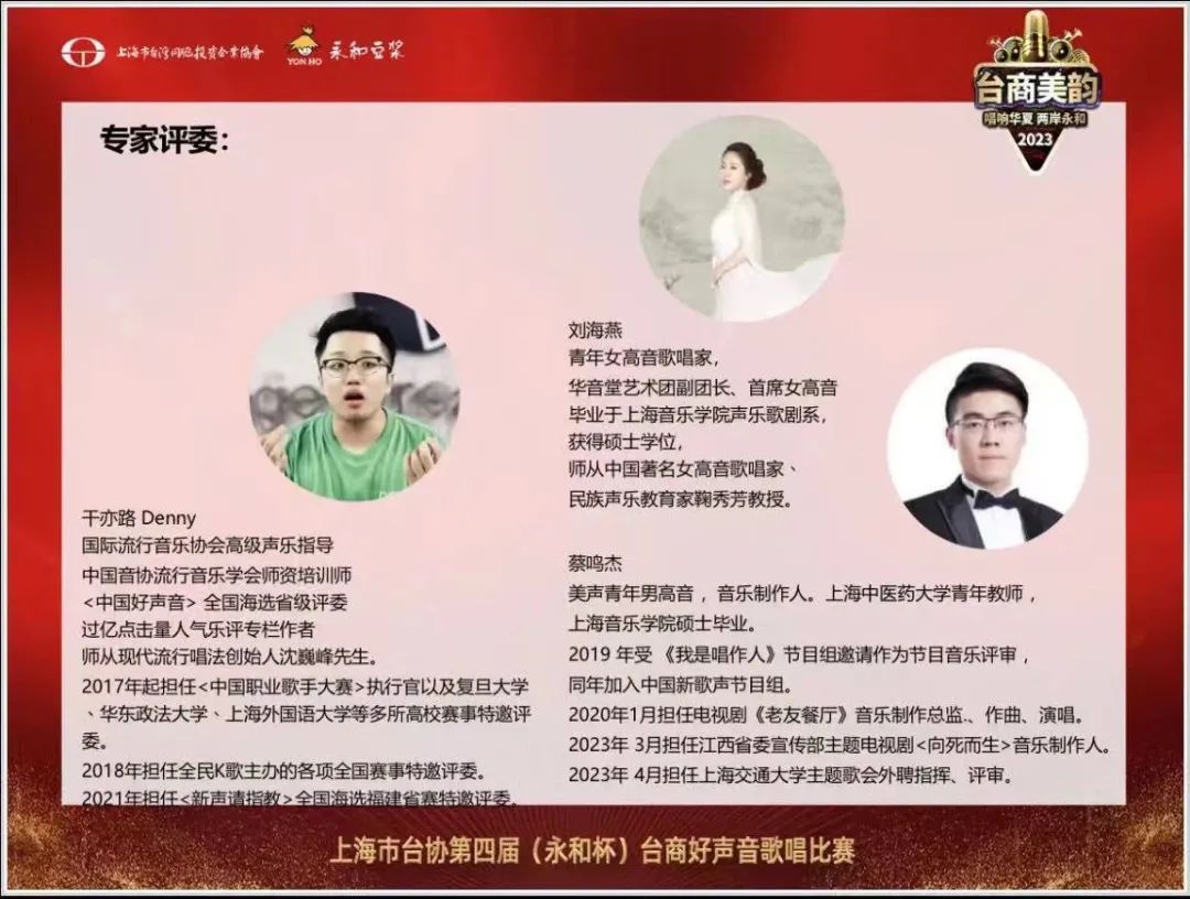 专业评委从歌曲内容、音色音质、演唱技巧、台风形象、综合素质等多个维度给出评价。经典老歌、流行歌曲、走心原创……,来自各行各业200多名在沪台胞台商朋友们的报名作品,年龄跨距从10岁到65岁,唱出了融合、发展、交流、合作的共同心声,生动展现了在沪台胞台商的时代风采!
