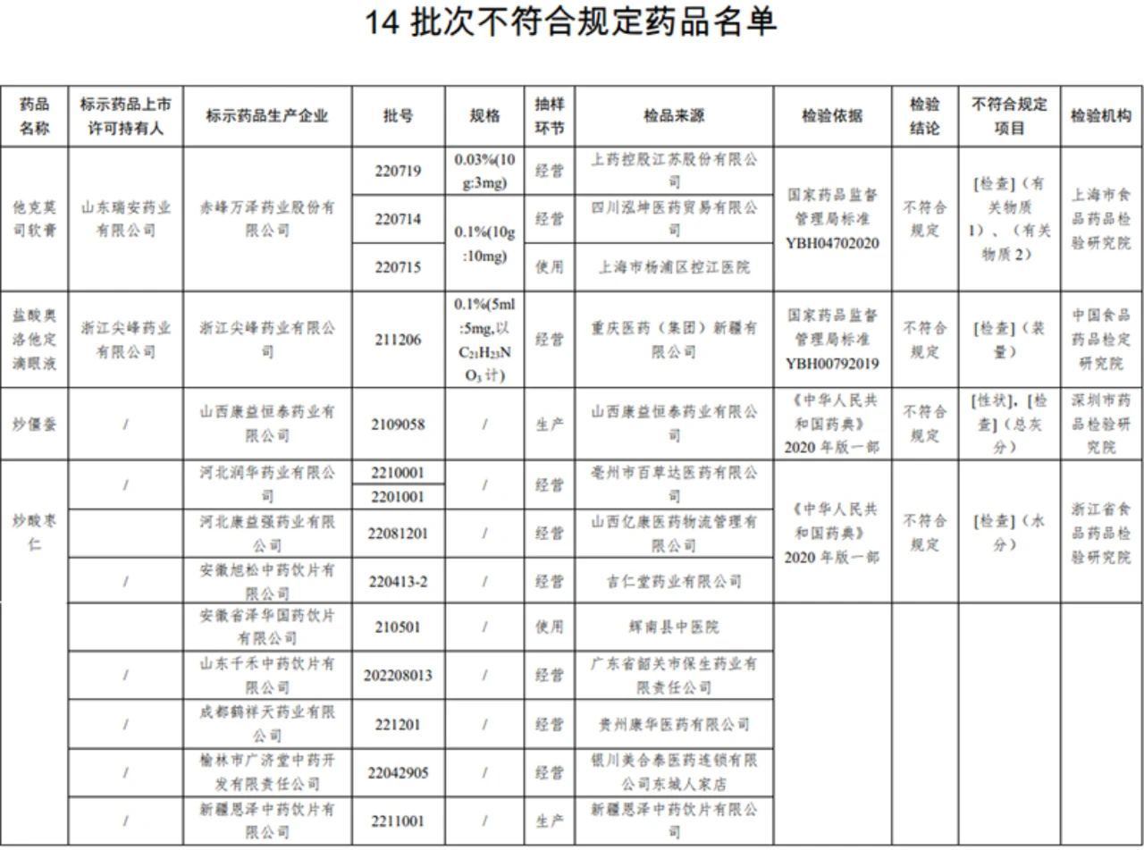 经浙江省食品药品检验研究院检验,标示为河北润华药业有限公司、河北康益强药业有限公司、安徽旭松中药饮片有限公司、安徽省泽华国药饮片有限公司、山东千禾中药饮片有限公司、成都鹤祥天药业有限公司、榆林市广济堂中药开发有限责任公司、新疆恩泽中药饮片有限公司生产的9批次炒酸枣仁不符合规定,不符合规定项目为水分。水分系指药品中的含水量。水分偏高通常与工艺、包装不当以及储运环境等因素有关。