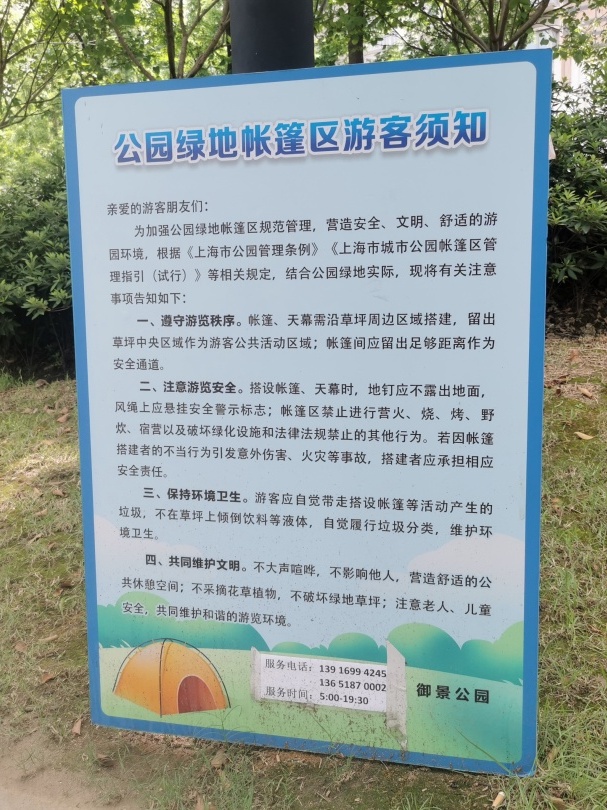 开放试点后, 区绿化市容局调研发现,晴天的周末及节假日市民搭建帐篷数量较多,但存在公园绿地中搭建天幕的情况,这在之前的《管理细则》和《游客须知》 中并不允许。有群众表示,气温高的时候,一直待在帐篷很闷,需要在天幕下才能更好地享受环境带来的舒适。