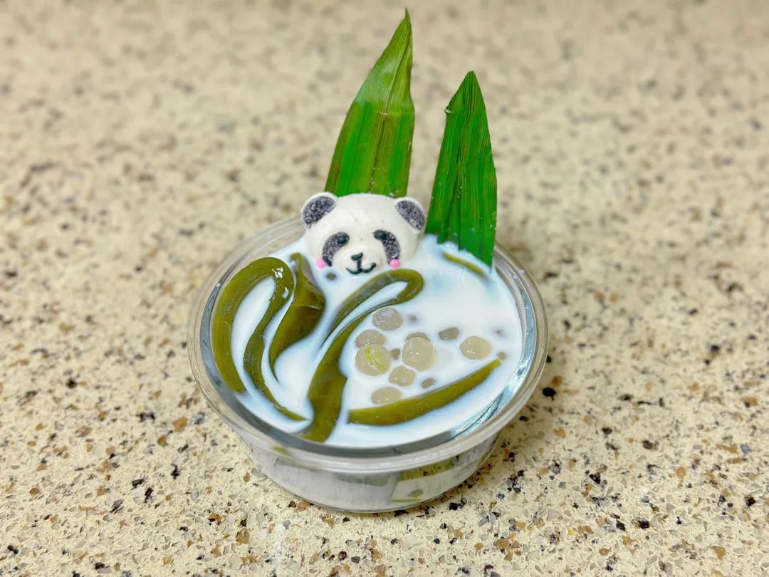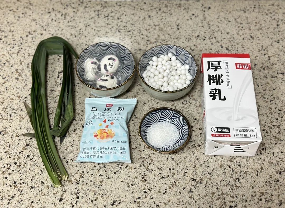 4.将冷藏成型的斑斓粉取出,用小刀划成条状,依次将粉圆、斑斓粉、熊猫棉花糖放入碗中,进行摆盘,最后浇上椰汁,完成。